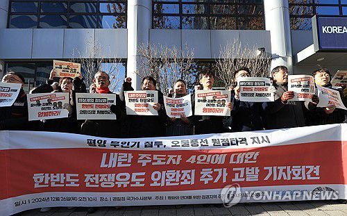 (서울=연합뉴스) 신현우 기자 = 26일 오전 서울 서대문구 경찰청 국가수사본부 앞에서 '평화와 연대를 위한 접경지역 주민·종교·시민사회 연석회의', '윤석열 즉각퇴진·사회대개혁 비상행동' 관계자들이 윤석열 대통령과 김용현 전 국방부 장관, 여인형 국군방첩사령관, 노상원 전 정보사령관을 외환죄 혐의로 고발하기에 앞서 기자회견을 하며 구호를 외치고 있다. 2024.12.26