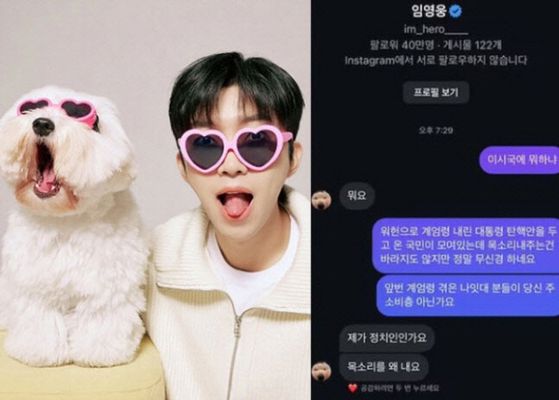 앞서 임영웅은 지난 7일 자신의 인스타그램에 반려견의 생일을 축하한다는 게시물을 올렸다. 이날은 윤 대통령에 대한 탄핵소추안이 국회 본회의에서 표결에 부쳐진 날로 전국적으로 대통령 탄핵을 촉구하는 촛불 집회가 열리기도 했다.