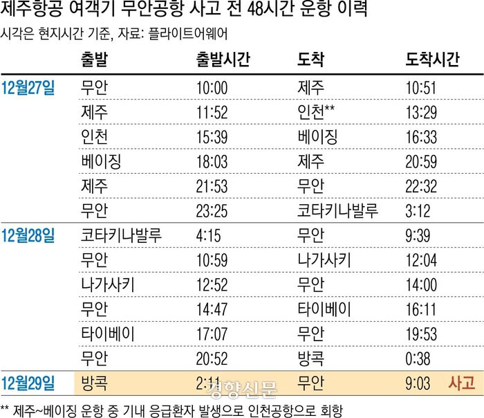 사고기, 최근 48시간 동안 13차례 운항…제주항공 “기체 이상징후 없었다”[제주항공 여객기 참사]