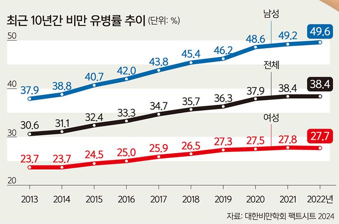 국내 비만 인구는 10년 새 꾸준히 증가했다. 대한비만학회 팩트시트2024에 따르면, 지난 10년간 비만 유병률은 30.6%에서 38.4%까지 치솟았다. 특히 남성의 경우 37.9%에서 49.6%로 증가, 사실상 대한민국 성인 남성 2명 중 한 명은 비만으로 추정된다. 특히 2단계 이상 유병률 증가가 두드러졌다. 2013년에 비해 2022년 2단계 비만 유병률은 3.8%에서 6.1%로 1.6배, 3단계 비만 유병률은 0.45%에서 1.18%로 2.6배로 증가했다.