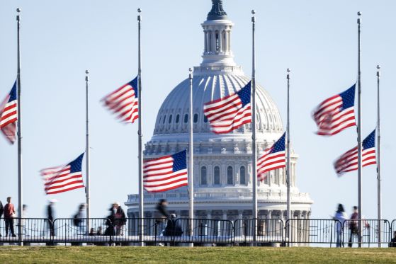 현지시간 30일 미국 워싱턴 DC의 의회 의사당 앞에 지미 카터 전 미국 대통령의 별세를 추모하는 조기가 게양돼 있다. EPA=연합뉴스