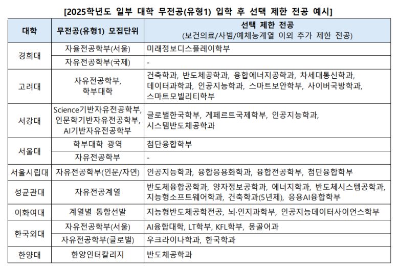 유형1 모집단위로 지원한다고 해서 대학 입학 후 모든 전공을 선택할 수 있는 것은 아니다. 의예, 간호와 같은 보건의료계열, 사범계열 등 정부가 정원을 관리하는 전공이나 예체능계열 외에도 희소‧특수학과, 첨단학과, 계약학과 등을 선택할 수 없도록 제한한 대학이 많다. 따라서 관심 대학의 모집요강이나 학과 소개 자료 등을 통해 자유전공 선택 시 가능한 전공을 확인 후 지원하는 것이 바람직하다.