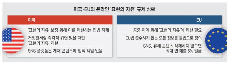 유럽에서는 SNS 기업이 유해 콘텐츠를 지나치게 느슨하게 관리한다고 지적하며 관련 규제를 강화하는 추세다. 유럽연합(EU)이 2022년 제정한 디지털서비스법에서는 기업이 불법 콘텐츠를 신속히 삭제하지 않으면 최대 연간 매출의 6%에 해당하는 벌금을 내도록 하고 있다. 엑스를 조사했던 EU는 엑스가 불법 콘텐츠와 허위 정보 확산을 막지 못해 디지털서비스법을 위반했다고 지난해 7월 잠정 결론을 내렸다. 영국 역시 온라인상 발언을 규제하기 위해 2023년 비슷한 법을 제정했다. 유럽은 표현의 자유에 제한을 두지 않으면 민주주의와 공중의 이익에 위협이 될 수 있다고 보고 있다.