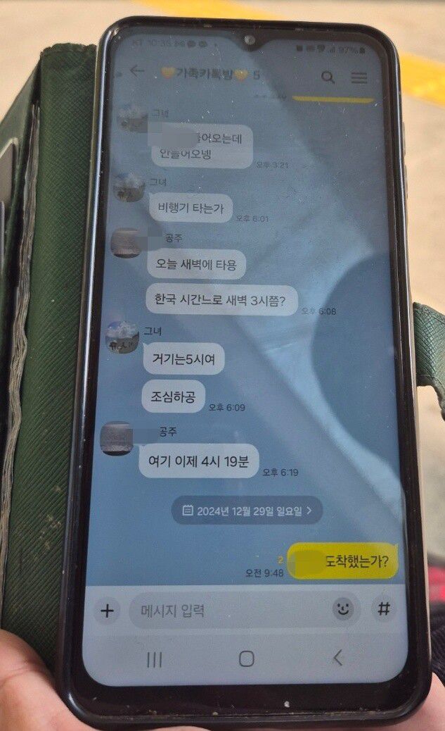 타이 공항에서 고인은 가족 카카오톡 대화방에 문자를 보냈다. “비행기 타느냐”고 묻자, “오늘 새벽에 타용”이라고 했다. ‘셀카’도 찍어 보냈다. 그런데도 그날 오전 도착 소식이 없는 ‘공주’에게 아버지는 “도착했는가?”라고 물었다. 하지만 답변이 없었다. 참사 소식을 듣고도 엄마는 딸의 ‘죽음’을 받아들이질 않았다. 하지만 “왼손 손톱의 네일아트”를 본 엄마는 그 자리에서 털썩 주저앉아 통곡했다. 이날 저녁 가족들은 ㄱ 기자가 사고 항공기에 남기고 간 불에 그을린 작은 손가방과 인형 등 유류품을 담은 상자를 건네받았다.