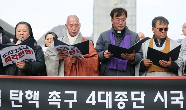 국내 7대 종교 대표자로 구성된 한국종교지도자협의회(종지협)도 가세했다. 종지협은 불교, 개신교, 천주교, 유교, 천도교, 원불교, 민족종교 등 7개 종단 수장이 모인 종교협의체로, 정기적으로 대통령을 대면해 국정 현안에 대한 조언을 건넨다. 이 단체는 "국가적 혼란과 헌법 질서의 훼손 상황은 국민 모두를 고통과 불안으로 몰아넣었다"며 "헌법 기관들이 국민의 고통에 귀 기울이고, 법과 절차에 따른 민주적 해결에 나설 것을 촉구한다"고 목소리를 높였다.