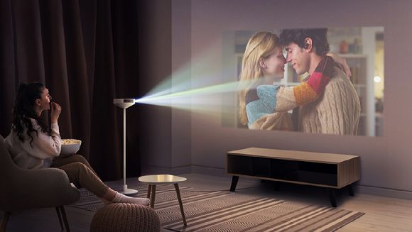 초소형 'LG 시네빔 쇼츠(PU615U)'로 가까운 거리에서 대화면을 투사해 콘텐츠를 감상하는 모습. [사진=LG전자] |