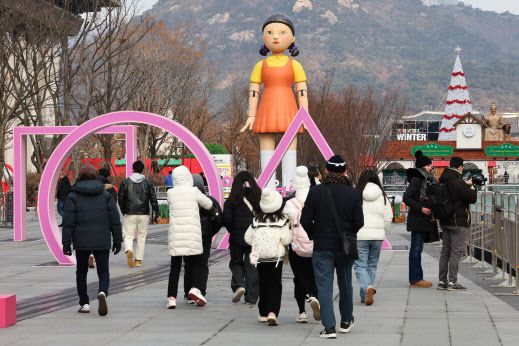 1일 서울 종로구 광화문광장에 넷플릭스 드라마 오징어게임2에 등장하는 영희 조형물이 설치돼 있다. 넷플릭스 공식 사이트 ‘넷플릭스 톱 10’에 따르면 지난 12월 넷째 주(23∼29일) 오리지널 시리즈 ‘오징어 게임2’의 시청 시간은 4억8천760만 시간으로 집계됐다.(사진=연합뉴스)