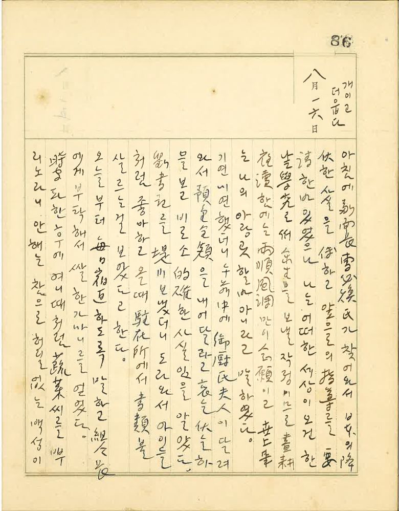 아침에 부면장 조필환(曺必煥) 씨가 찾아와서 일본이 항복한 사실을 전하고 앞으로의 지도를 요청한 바 있었으나 나는 어떠한 세상이 오건 한낱 학구(學究)로서 여생을 보낼 작정이므로 주경야독(晝耕夜讀)함에는 우순풍조(雨順風調)만이 염원이고 세상사는 나의 아랑곳할 바 아니라고 말하였다.