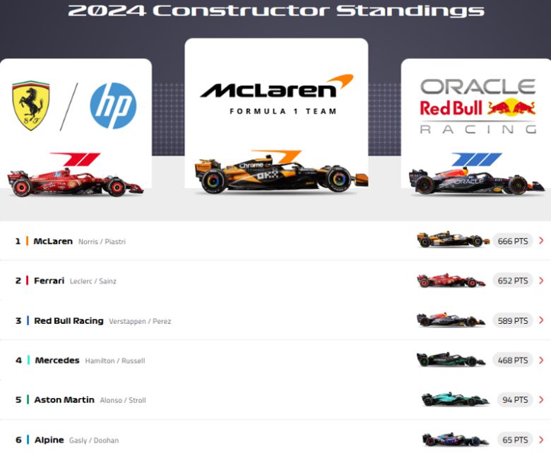 컨스트럭터 포인트 순위 순서대로 팀과 선수를 살펴보겠습니다. 참고로 컨스트럭트 포인트는 각 팀의 드라이버들이 1년 동안 모은 점수를 합산한 순으로 매깁니다. 2024년 컨스트럭터 포인트 1위는 666점을 기록한 맥라렌입니다. 2위는 652점을 기록한 스쿠데리아 페라리팀이, 3위는 589점의 레드불 레이싱이 차지했습니다. 내친김에 10위까지 쭉 살펴보겠습니다. 메르세데스가 468점으로 4위에 올랐습니다.