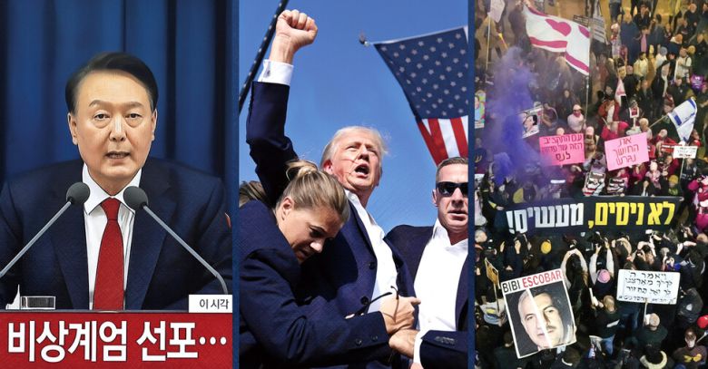 윤석열 정부의 계엄 선포(맨 왼쪽)는 민주주의 책 분출의 도화선이 되었다. 올초 미국 도널드 트럼프 대통령(가운데)의 집권 2기가 시작되고,된다. 계속되는 중동의 이스라엘-하마스 전쟁(맨 오른쪽)과 러시아 우크라이나 침공 전쟁은 올해도 국제 정세 변화의 중심에 있다. 한겨레 자료사진, 연합뉴스