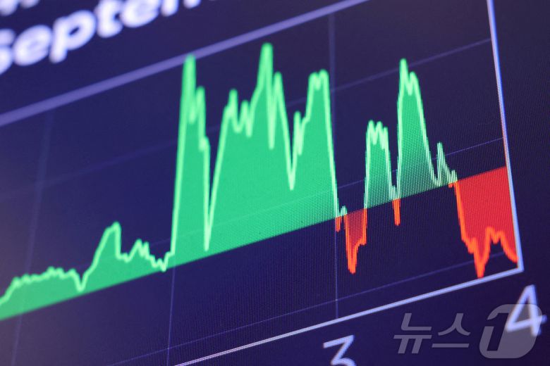뉴욕증권거래소 디스플레이에 표시된 다우 지수 그래프 ⓒ 로이터=뉴스1 |