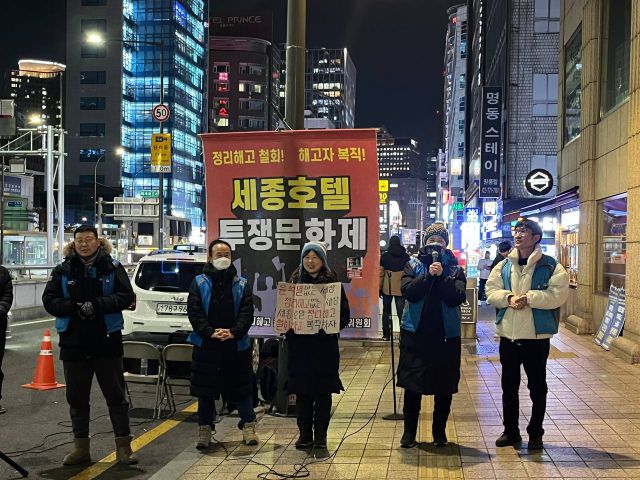 모란공원에서 일정을 마치고 명동에 있는 세종호텔 앞으로 향했다. 오늘은 '세종호텔 신년투쟁의 밤' 집회가 열리는 날이었다. 세종호텔 사측은 코로나19로 인한 경영 악화를 핑계로 내세우며 실제로는 노조를 탄압하기 위한 일방적인 해고를 단행했다. 세종호텔 해고 노동자들은 3년째 복직 투쟁을 이어가고 있다. 늘 웃음을 잃지 않고 단단하게 싸움을 이어 나가는 세종호텔 노동자들은 오늘도 온화하면서도 강한 표정과 목소리로 정당한 투쟁을 이어갔다. 세종호텔 집회에 거의 빠지지 않고 함께하는 지혜복 교육 노동자도 볼 수 있었다. 지혜복 교육 노동자는 30년 넘게 교단에 섰던 선생님으로 학교 내 성폭력 사건을 해결하려 하고 공익제보했다가 이를 외면하는 학교와 교육청에 의해 부당전보 및 해임을 당했다. 평소와 마찬가지로 지혜복 노동자도 당당하면서도 부드러운 모습으로 집회에 모인 사람들과 함께했다.