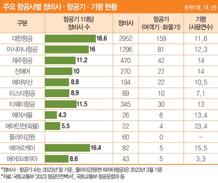 국토교통부 ‘항공안전백서’에 따르면 2023년 말 기준 국내 12개 항공사의 정비사 총 5849명 가운데 4248명(72.6%)이 대형사인 대한항공, 아시아나항공 2개 회사 소속이었다. 제주항공, 진에어 등 LCC 10개 회사의 정비사는 모두 합쳐 1601명에 그쳤다. 또 대형 항공사들은 항공기 1대당 17.7명의 정비사를 보유했지만 LCC는 10.6명이었다. 정부가 내세운 기준(1대당 정비사 12명)에 못 미치는 실정이다. LCC 중에서는 정비사 수가 가장 많은 티웨이항공(11.5명), 제주항공(11.2명)도 기준에 못 미쳤다.