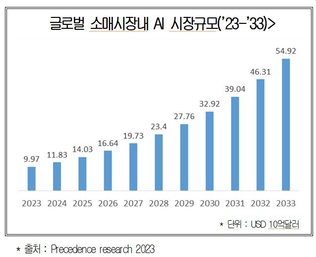 이를 반영하듯 글로벌 유통산업내 AI 시장규모는 2023년 99억7000만달러(한화로 약 14조5023억원)에서 2033년 549억2000만달러(79조8866억원)으로 약 5.5배 성장할 전망이다.