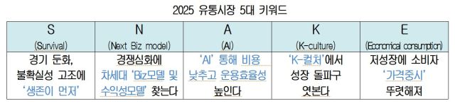 [디지털데일리 백지영기자] 푸름 뱀의 해인 2025년, 유통업계의 키워드로 'S.N.A.K.E'가 제시됐다. 이는 각각 ▲S(Survival), ▲N(Next Biz모델), ▲A(AI), ▲K컬처(K-culture), ▲E(Economical consumption)를 뜻한다.