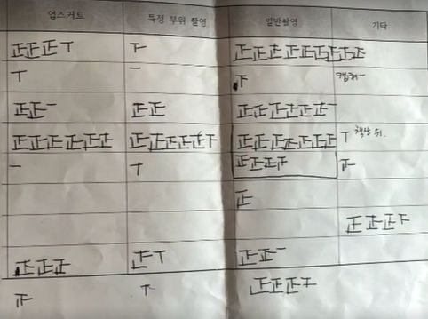 교사들 이름 옆에 항목이 마련됐다. ‘업스커트’, ‘특정 부위 촬영’, ‘일반 촬영’ 등 각 교사 별로 바를 정(正)자로 촬영 횟수가 표기됐다. 수시 합격 후 조직적으로 여성 교사 대상 불법 촬영 행각을 해온 고3 학생이 무사히 대학에 등록했다는 소식이 전해졌다.