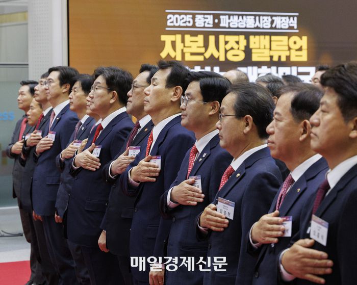 2025 증권파생시장 개장식 2일 오전 서울 여의도 한국거래소(KRX) 홍보관에서 열린 2025 증권파생시장 개장식에서 내빈들이 국기에 경례하고 있다. 25.01.02 한주형기자 |