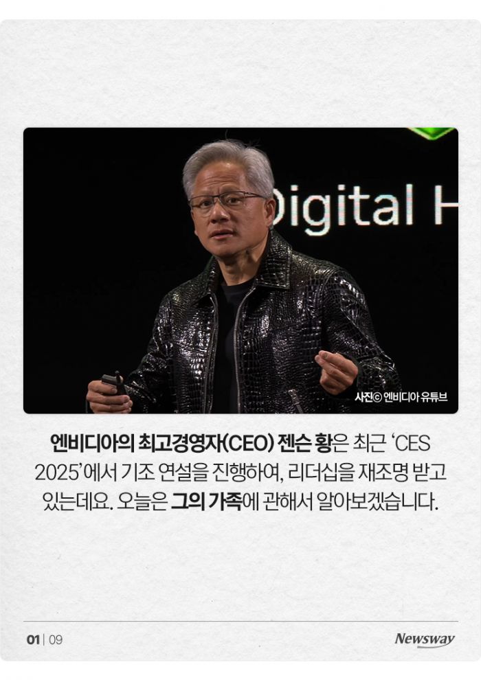 엔비디아의 최고경영자(CEO) 젠슨 황은 최근 'CES 2025'에서 기조 연설을 진행하여, 리더십을 재조명 받고 있는데요. 오늘은 그의 가족에 관해서 알아보겠습니다.