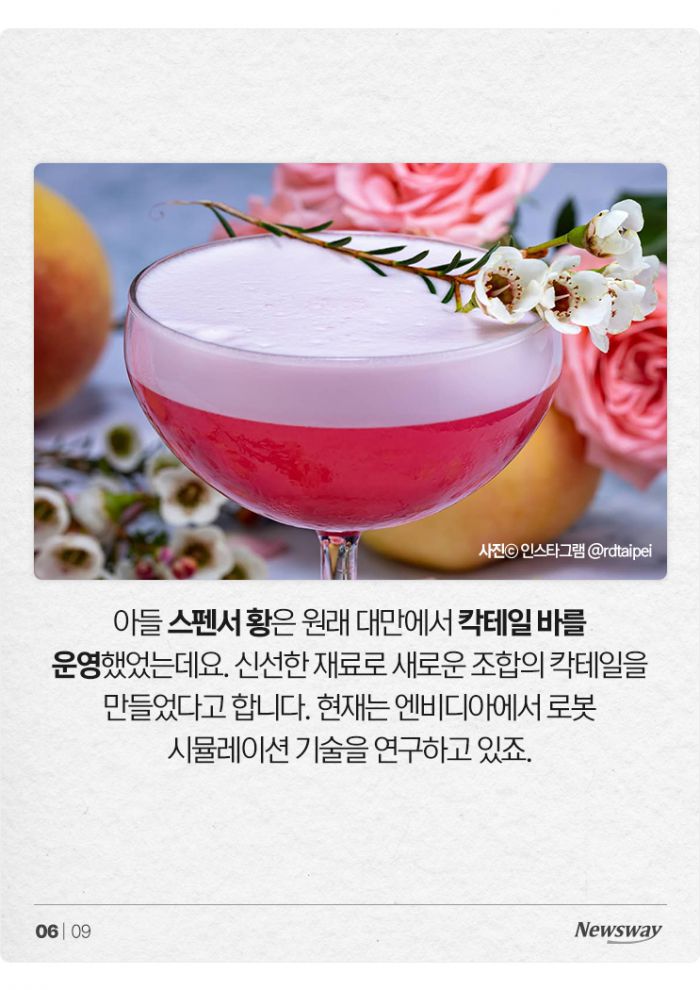 아들 스펜서 황은 원래 대만에서 칵테일 바를 운영했었는데요. 신선한 재료로 새로운 조합의 칵테일을 만들었다고 합니다. 현재는 엔비디아에서 로봇 시뮬레이션 기술을 연구하고 있죠.