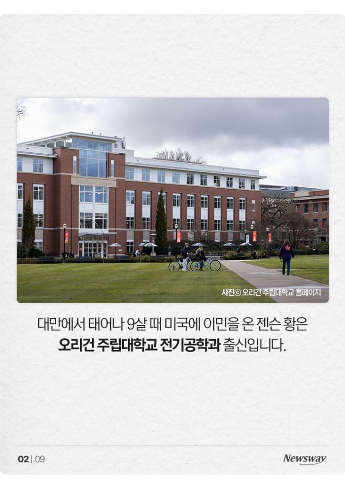 대만에서 태어나 9살 때 미국에 이민을 온 젠슨 황은 오리건 주립대학교 전기공학과 출신입니다.