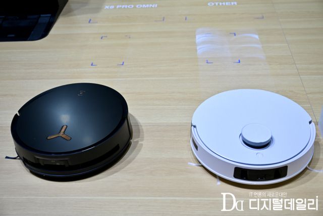 [디지털데일리 김문기 기자] 두 대의 로봇청소기가 출발선에 놓인다. 그 앞에 흰색의 물감으로 바닥을 색칠한다. 잠시 후 두 대의 로봇청소기가 물감을 닦기 위해 출발한다. 열심히 물걸레 청소를 마친 로봇청소기가 목적지에 다다른다. 구식 에코백스 로봇청소기 모델 쪽은 물걸레 청소 방향대로 흔적이 남았지만, ‘디봇 X8 프로 옴니’ 쪽은 깨끗하다. 자동 세척 물걸레 기술로 닦자마자 세척하는 능력이 빛을 발한 순간이다.