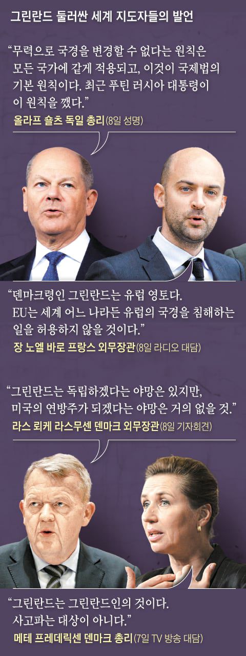 올라프 숄츠 독일 총리는 8일 성명을 통해 “(최근 트럼프 발언에 대해) 여러 유럽 지도자들과 이야기를 나눴다”며 “무력으로 국경을 변경할 수 없다는 원칙은 모든 국가에 동일하게 적용되고, 이것이 국제법의 기본 원칙”이라고 밝혔다. 트럼프가 전날 기자 회견에서 ‘파나마 운하와 그린란드 장악을 위해 군사력 사용도 배제하지 않겠다는 취지로 발언한 것을 정면으로 겨냥한 것이다.
