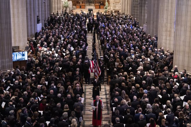 성조기에 싸인 관이 대성당 한복판을 가로질러 단상 위로 운구됐고 추도객들은 오른손을 가슴에 대고 고인에 대한 예를 표했다.