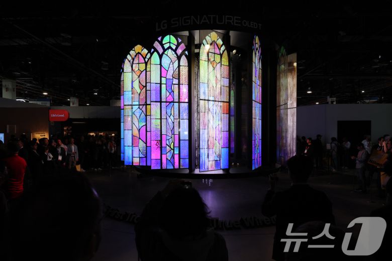 세계 최대 정보기술(IT)·가전 전시회 'CES 2025' 개막일인 7일(현지시간) 미국 네바다주 라스베이거스 컨벤션센터(LVCC)에 마련된 LG전자 부스에서 관람객들이 'LG 시그니처 올레드 T' 28대로 구성된 초대형 미디어아트를 관람하고 있다. 2025.1.8/뉴스1 ⓒ News1 신웅수 기자