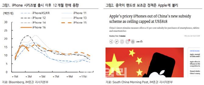 고 연구원은 “나아가 지난 1월 8일 중국은 핸드셋에 대한 보조금을 ‘중앙정부’ 차원으로 확대하기로 결정(세트당 최대 500위안 지급)했다”며 “이 또한 주로 로컬 브랜드 중심으로 지급될 것으로 보인다. 보조금 지급 대상을 6000위안 미만으로 제한하였기 때문이다(아이폰 16 프로 가격은 7999위안)”고 전했다.