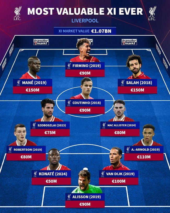축구 통계 매체 '트랜스퍼마크트'는 9일(한국시간) 공식 SNS를 통해 역대 리버풀 몸값 베스트11을 공개했다.