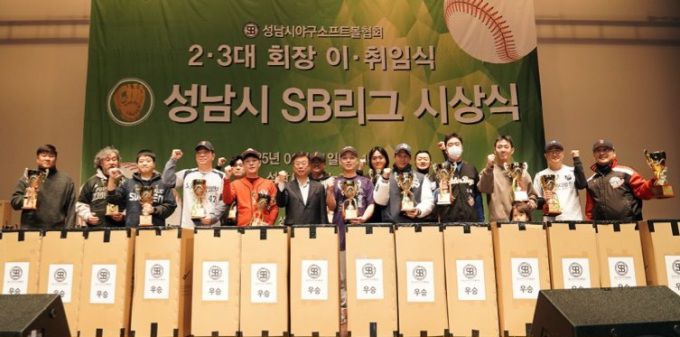 11일 오전 신상진 성남시장이 성남시야구소프트볼협회의 '2024년 성남시SB리그 시상식'에서 기념촬영 을 하고 있다.[사진=성남시] |