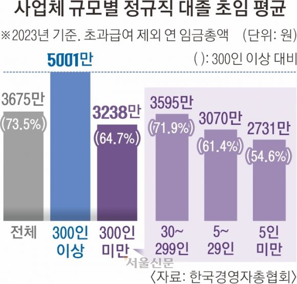 초과 수당을 더해도 연봉 격차는 좁혀지지 않았다. 임금 총액에 초과 수당을 포함하는 경우 300인 이상은 5302만원이지만 5인 미만은 2750만원, 5~29인 3138만원, 30~299인은 3735만원 등 300인 미만 사업체의 정규직 초임은 4000만원을 넘지 못했다. 하상우 경총 경제조사본부장은 “대기업 근로자의 고임금은 높은 대졸 초임에 연공형 임금체계, 노조 프리미엄까지 더해진 결과”라고 분석했다.