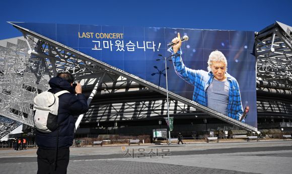 ‘가황’ 나훈아의 마지막 콘서트가 열린 지난 10일 한 시민이 서울 송파구 올림픽공원 KSPO돔 벽면을 장식한 나훈아의 대형 현수막을 촬영하고 있다. 공연 사진과 영상 노출을 극도로 꺼리는 나훈아 측은 이날 관객의 휴대전화 카메라 렌즈에 스티커를 붙이며 공연 촬영 불허를 알렸고, 언론 매체에도 공식 사진을 제공하지 않았다. 박지환 기자