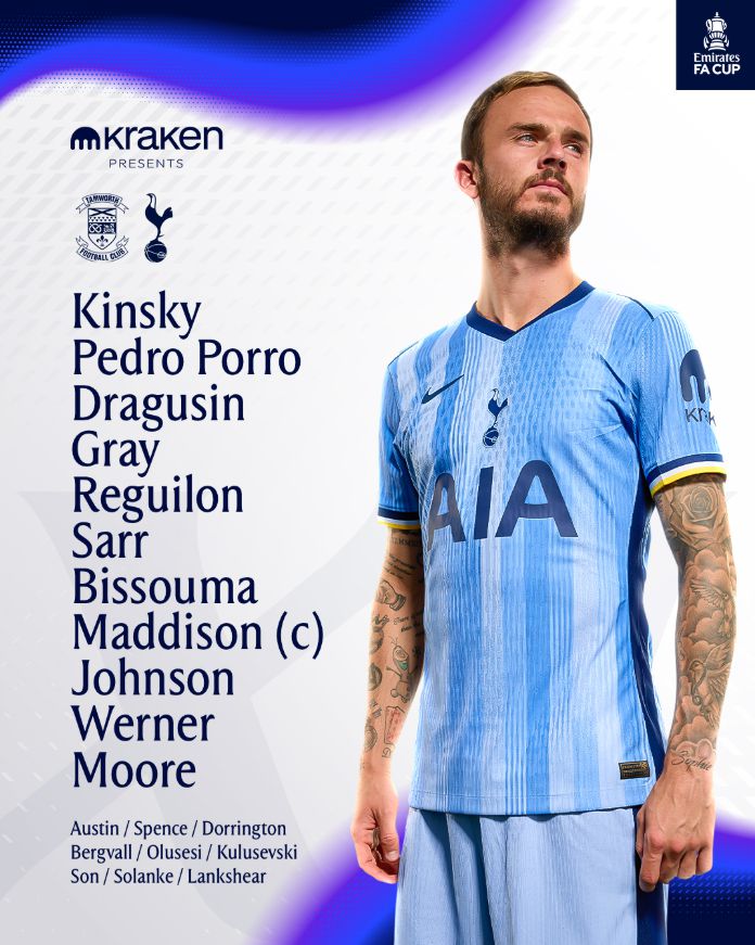 토트넘은 최전방에 티모 베르너, 2선에 마이키 무어, 제임스 매디슨, 브레넌 존슨을 배치했다. 중원에는 파페 사르와 이브 비수마를 포백에는 레길론, 아치 그레이, 라두 드라구신, 페드로 포로를 선발로 내세웠다. 골키퍼 장갑은 안토닌 킨스키가 낀다.
