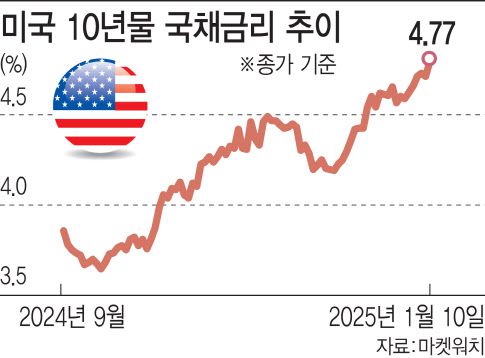 연준은 지난해 9월 0.5%포인트 인하를 시작으로 11월과 12월 각각 0.25%포인트씩 총 세 차례에 걸쳐 기준금리를 1%포인트 내렸다. 같은 기간 미국 10년물 국채금리는 3.6%에서 4.77%로 1.17%포인트 급등했다. 10년물 금리 상승 폭과 연준의 금리 인하 폭은 거의 같은 수준이다. 연준이 금리를 인하했음에도 장기금리가 상승한 건 1981년 1~10월 이후 이번이 두 번째다.
