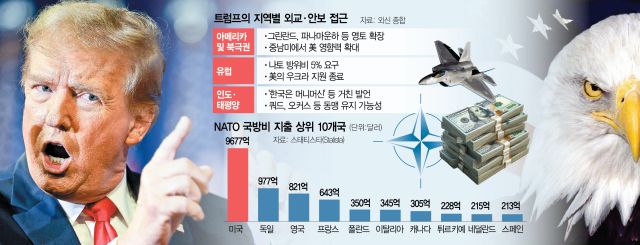 트럼프는 ‘앞마당’에서 확장의 야욕을 보이는 것과 달리 유럽의 안보 문제에서는 ‘각자도생’ 원칙을 강조하면서 ‘미국 우선주의’의 또 다른 얼굴을 보여주고 있다는 평가가 나온다. 트럼프는 이달 7일 기자회견에서 북대서양조약기구(NATO·나토) 회원국의 국방비 지출을 국내총생산(GDP)의 5%까지 늘려야 했다고 주장했다. 나토의 기존 지침인 2%를 훨씬 넘어서는 수준이며 트럼프가 대선 과정에서 언급한 3%보다도 높아진 것이다.