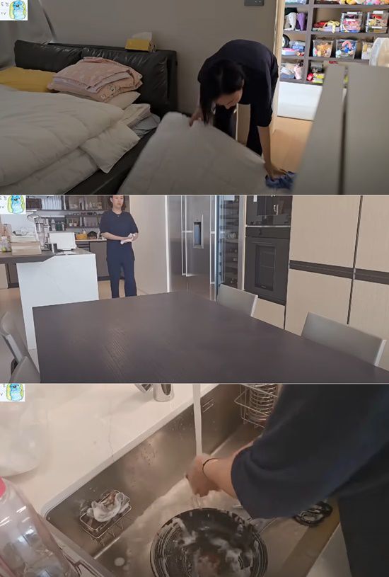 장윤정은 화장기 없는 얼굴과 자연스러운 복장으로 집안 곳곳을 돌아다니며 살림을 이어갔다. 이불 정리부터 테이블 정리, 설거지, 빨래 개기까지 쉬지 않고 집안일을 하며 살림꾼 매력을 발산했다.