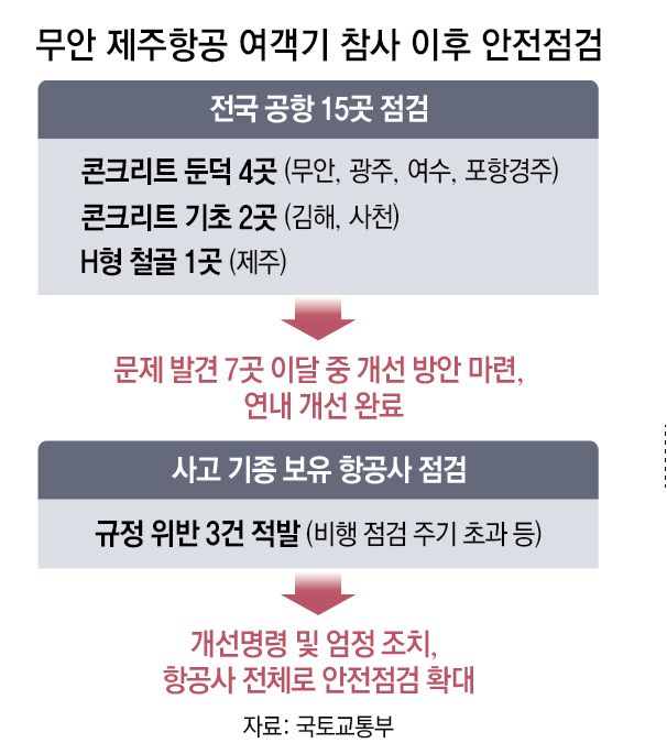 무안 제주항공 여객기 참사를 키운 원인으로 지목된 ‘콘크리트 둔덕’처럼 쉽게 부서지지 않는 시설물 위에 로컬라이저(방위각 시설)가 설치된 공항이 6곳이나 더 있는 것으로 조사됐다. 항공기 충돌 시 대형 피해가 발생할 수 있다는 우려가 커지자 국토교통부는 이달 중으로 위험 시설물 개선 방안을 발표하기로 했다. 또 4월까지 ‘셀프 조사’ 논란을 빚은 항공철도사고조사위원회(사조위)를 개편하고 공항 안전 규정도 정비하기로 했다.