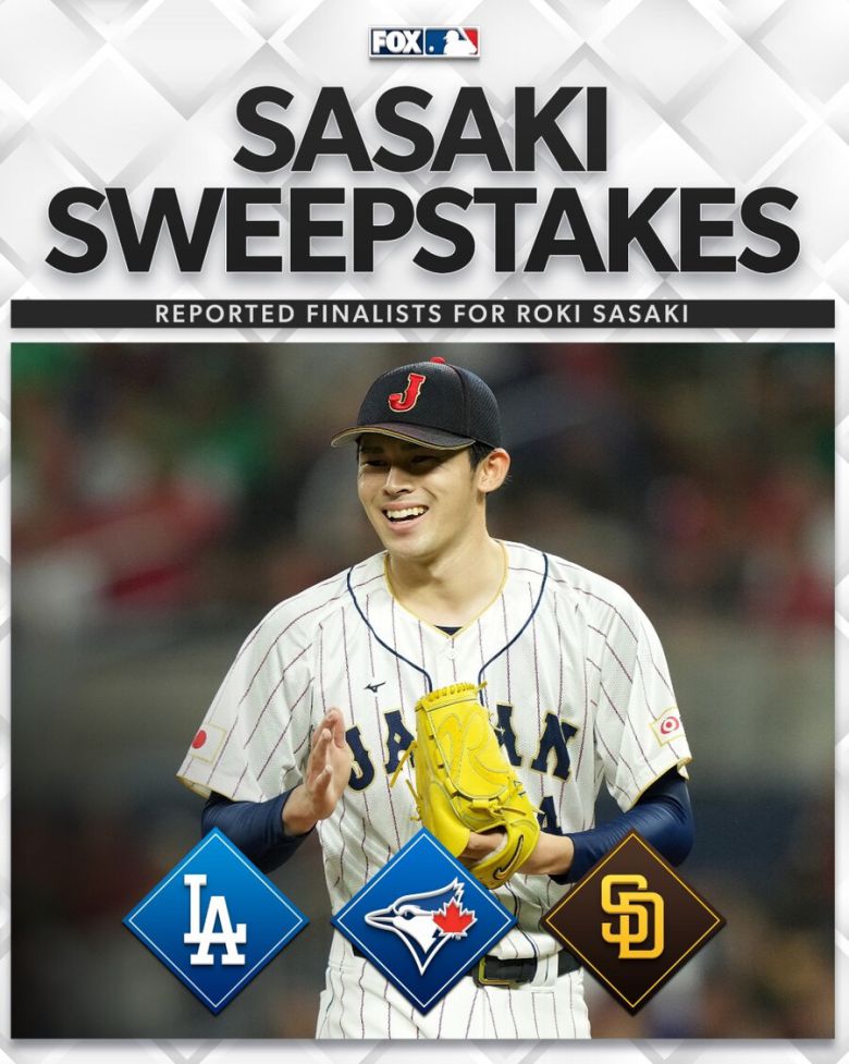 14일(한국시간) 현지 소식통들이 일제히 전한 정보에 따르면 사사키 영입전은 최종 단계로 향했으며, 행선지가 LA다저스와 샌디에이고 파드리스, 토론토 블루제이스 세 팀으로 압축됐다.
