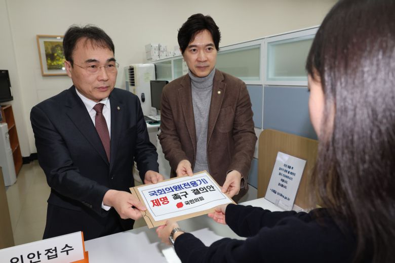 국민의힘 박성훈, 이종욱 의원이 14일 오전 서울 여의도 국회 의안과에서 더불어민주당 전용기 의원 제명촉구 결의안을 제출하고 있다. |