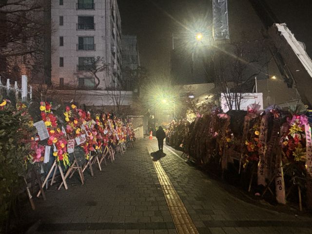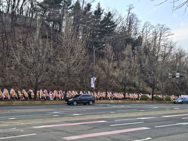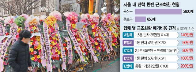 14일 서울경제신문 취재를 종합하면 현재 용산구에는 한남동 일대를 중심으로 총 2800개가 넘는 근조화환이 설치됐다. 종로구에도 헌법재판소 일대를 중심으로 650개 이상의 근조화환이 있고 정부서울청사 주변에도 수십 개의 근조화환이 한 달 넘게 방치돼 있다. 시민 보행권을 침해하고 도시 미관을 저해한다는 점도 우려되지만 더 큰 문제는 전국에서 보내진 막대한 규모의 화환을 관리·폐기하는 역할이 개별 구청에 맡겨졌다는 것이다. 화환 1개당 무게가 3~7㎏이라는 점을 고려하면 용산구는 최대 19.6톤에 달하는 폐기물을 떠안은 셈이다. 구청 관계자는 “한창 집회가 진행되고 있는 대통령 관저 부근 화환은 아직 철거하기 어렵다”면서 삼각지역·녹사평역 인근에 설치된 화환부터 점진적으로 철거할 예정이라고 설명했다.