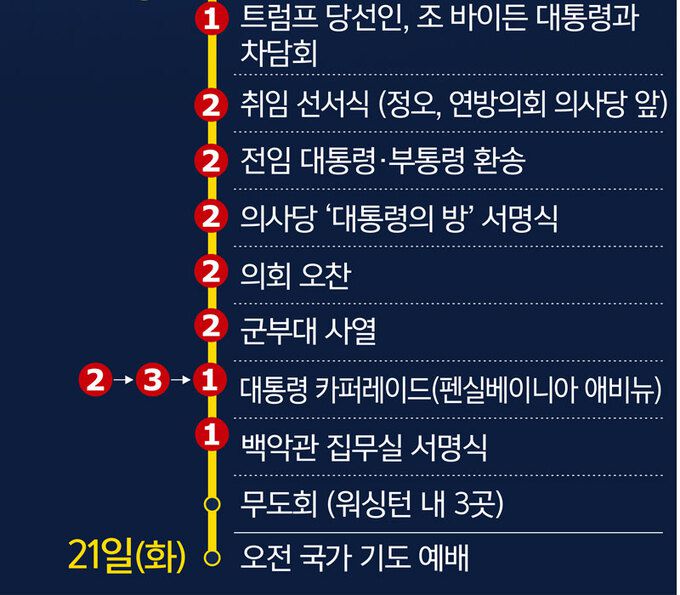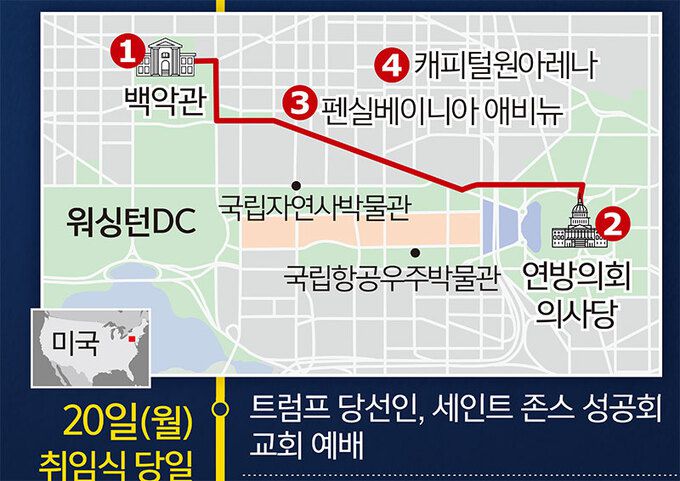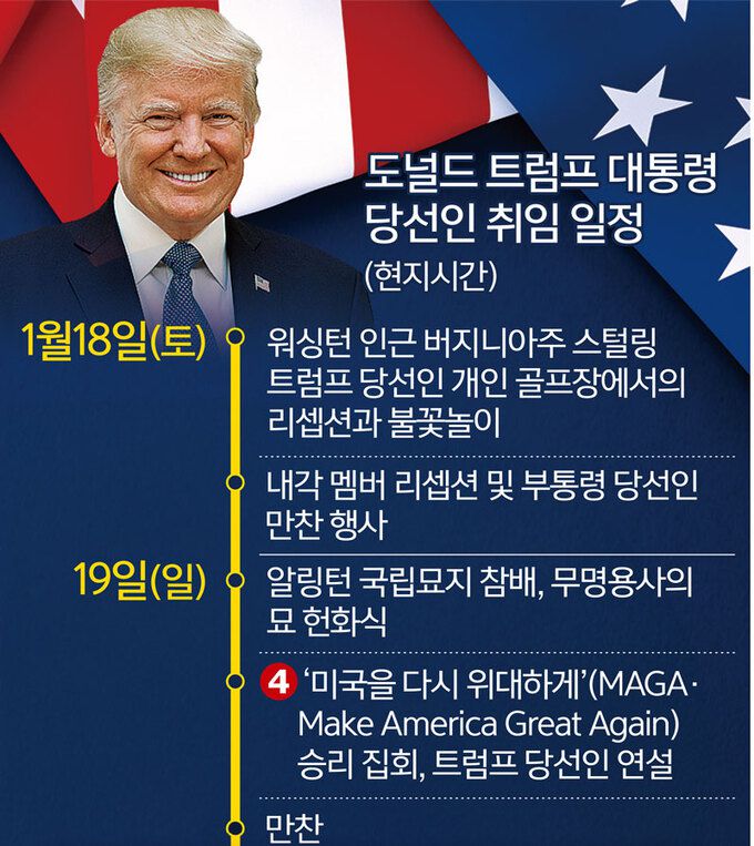 트럼프 당선인은 취임식 하루 전인 19일에는 알링턴 국립묘지를 찾아 무명용사의 묘에 헌화한다. 워싱턴의 대형경기장 캐피털원아레나에서 열릴 ‘미국을 다시 위대하게’(MAGA·Make America Great Again) 승리 집회에도 참석한다. 이 행사는 2021년 1월 워싱턴에서 있었던 대선 불복 집회 이후 트럼프 지지자들이 워싱턴 한복판에서 승리를 재확인하는 자리가 될 것으로 보인다.