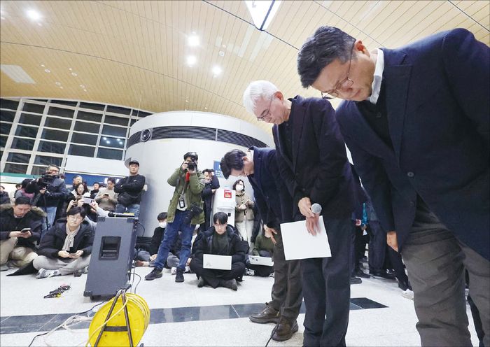 채형석 애경그룹 총괄부회장(사진 가운데) 등 애경그룹 경영진이 지난해 12월 29일 전남 무안군 무안국제공항에서 유가족들에게 사과하며 고개를 숙이고 있다. (연합뉴스) |