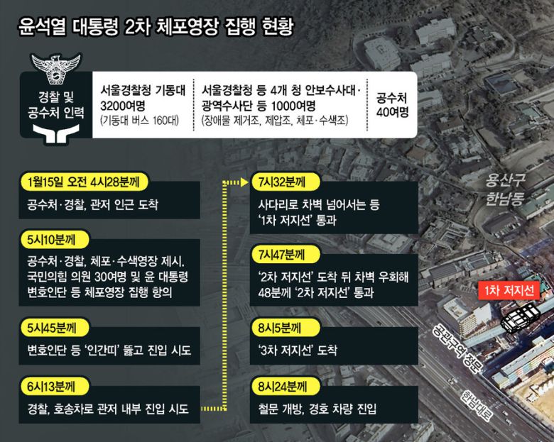새벽 4시28분께 체포영장을 지닌 공수처 수사팀과 경찰 특수단이 관저 정문 앞에 도착했다. 체포 작전에 투입된 서울경찰청, 경기북부 및 경기남부경찰청, 인천경찰청 소속 광역수사대 경찰들도 잇따라 도착했다.