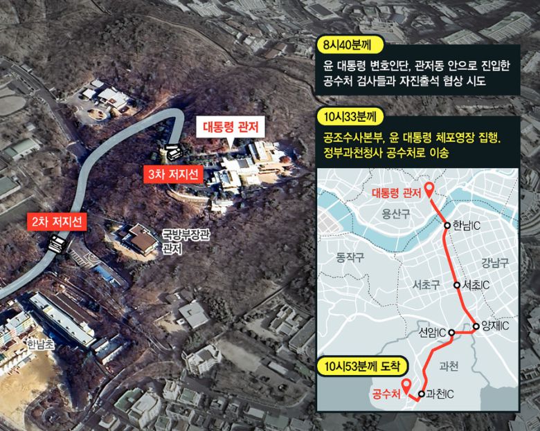 1차 저지선을 통과한 뒤부터 관저 바로 코앞 초소까지 이동은 거침없이 이뤄졌다. 공조본은 30여분 만에 관저 코앞까지 도착했고, 공수처 검사가 곧장 윤 대통령 변호인단, 정진석 대통령 비서실장과 함께 관저 내부로 들어갔다. 이후 오전 8시40분께부터 윤 대통령의 출석 형식과 호송 방식을 두고 협상을 벌였다. ‘자진 출석’ 형식으로 경호처 차를 타고 공수처로 이동하겠다는 윤 대통령 쪽과 ‘영장 집행’ 형식으로 호송차를 타고 가야 한다는 공수처 쪽의 밀고 당기기가 2시간 가까이 이어졌다. 결국 10시33분께 공수처는 윤 대통령에 대한 체포영장을 집행했고, 윤 대통령은 호송차가 아닌 경호처 차량을 타고 경기도 과천 공수처로 이동했다.