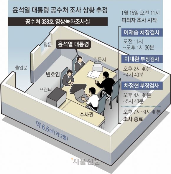 공수처에 따르면 이날 오전 11시쯤 공수처가 위치한 정부과천청사 5동 338호 영상녹화조사실에서 윤 대통령에 대한 피의자 조사가 시작됐다. 윤 대통령 측의 거부로 영상 녹화는 진행되지 않았다. 조사실의 크기는 일반 피의자들이 조사받는 곳과 비슷한 6.6㎡(2평) 규모로 알려졌다. 대통령에 대한 예우 차원에서 조사에 앞서 오동운 공수처장과의 면담이 이뤄질 것이란 관측도 나왔지만 별도 티타임은 없었다. 다만 조사를 진행하며 공수처 수사팀은 윤 대통령에게 ‘대통령님’이라고 호칭했다.