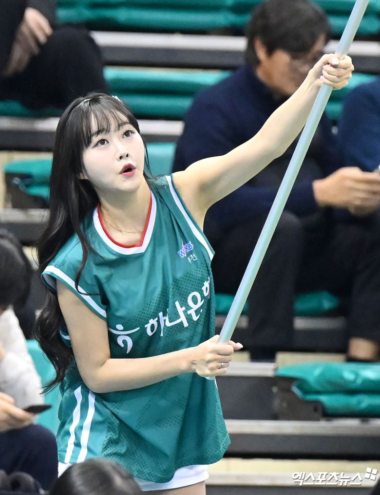 (엑스포츠뉴스 부천, 김한준 기자) 15일 오후 부천시 원미구 부천체육관에서 열린 '하나은행 2024~2025 여자프로농구' 하나은행과 우리은행의 경기, 정가예 치어리더가 열띤 응원을 선보이고 있다.