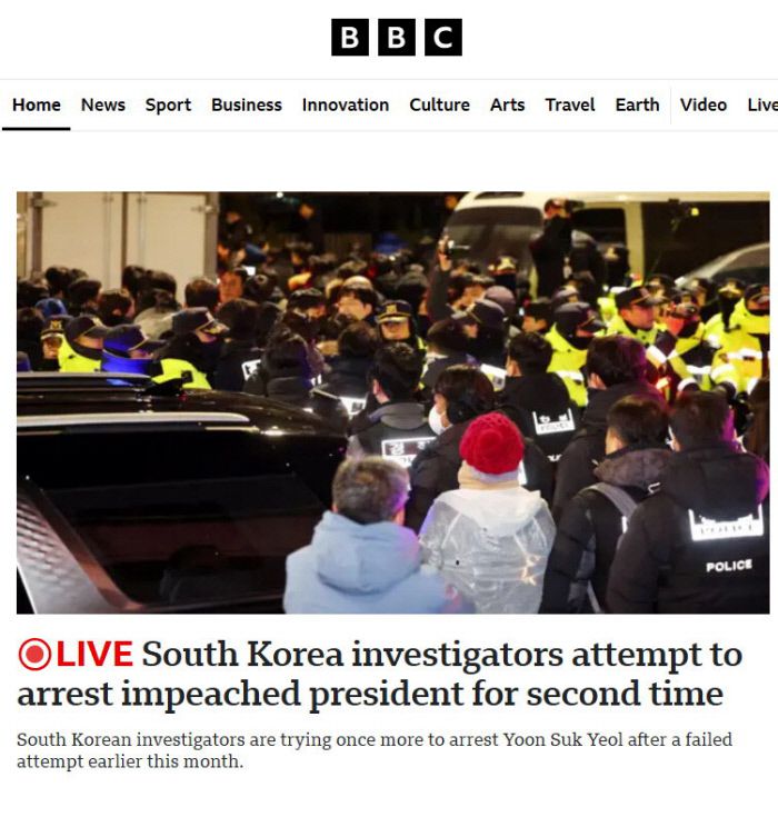 영국 BBC는 윤 대통령의 영장 집행 상황을 이른 오전부터 실시간 생중계 업데이트로 전했다. 그러면서 윤 대통령 체포 후에도 한국은 ‘불확실성에 휩싸인 국가’라고 평가했다. “오랫동안 보수와 진보의 극심한 분열로 점철된 한국 정치는 윤 대통령 탄핵과 체포 이후 더욱 혼란에 빠졌다”는 것이다. 또 “앞으로 계속되는 정치 드라마에서 또 하나의 국면일 뿐”이라고 했다.