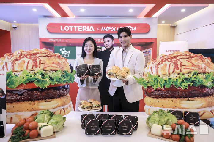 [서울=뉴시스] 정병혁 기자 = 16일 서울 용산구 롯데리아 숙대입구점에서 열린 '나폴리맛피아 모짜렐라버거' 2종 출시 사진행사에서 모델들이 제품을 선보이고 있다. 롯데리아는 '모짜렐라 버거'의 10주년을 맞아 스타 셰프인 '나폴리맛피아' 권성준 셰프와 협업해 토마토바질 나폴리맛피아 모짜렐라 버거와 발사믹 바질 나폴리맛피아 모짜렐라 버거 2종을 출시했다. 2025.01.16. jhope@newsis.com