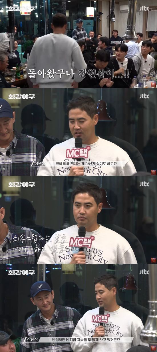 공개된 영상에서 장원삼은 장시원 PD의 소개로 회식을 즐기던 선수들 앞에 등장해 "이렇게 좋은 날에 제가 와서 폐를 끼치는 게 아닌가 싶다. 일단 제가 그날 안 좋게 나오게 됐는데, '최강야구' 제작진이랑 감독님, 코치님, 우리 동료 선수들한테 제대로 인사도 못 하고 나온 거 같다. 그래서 너무 죄송스럽다는 말을 여기서 하고 싶다"고 고개를 숙였다.